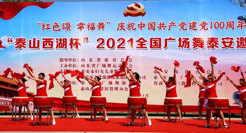 在当天″泰山西湖杯"2021全国广场舞泰安邀请赛启动仪式首场演出和第二场演出中,我市南风健身舞蹈队女子锣鼓作为开场节目,鼓舞相济,动作奔放,声声鼓乐在西湖岸边、在泰山脚下久久回荡…赢得在场的泰山市政府领导和数千观众的阵阵掌声。