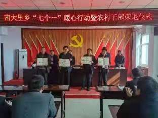 南大里乡党委、政府当天召开了离任"两委"主干座谈会,并举行了卸任仪式,乡党委书记秦晨林、党委付书记、乡长张志荣和班子成员,先后为10名离任"两委"主干频发了"耕耘基层先进个人"荣誉证书。这些老将们个个畅所欲言,人人谈情况、说想法、传经验,把乡村振兴的"接力棒"放心的交给了新一任村"两委"主干手中。