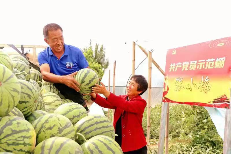 (本网讯 景继光 通讯员 张秀峰)2022年5月22日,山西省运城市夏县精品农业联合党支部党小组长张小梅和妻子正在为沈阳客商采摘“夏乐"牌精品西瓜。