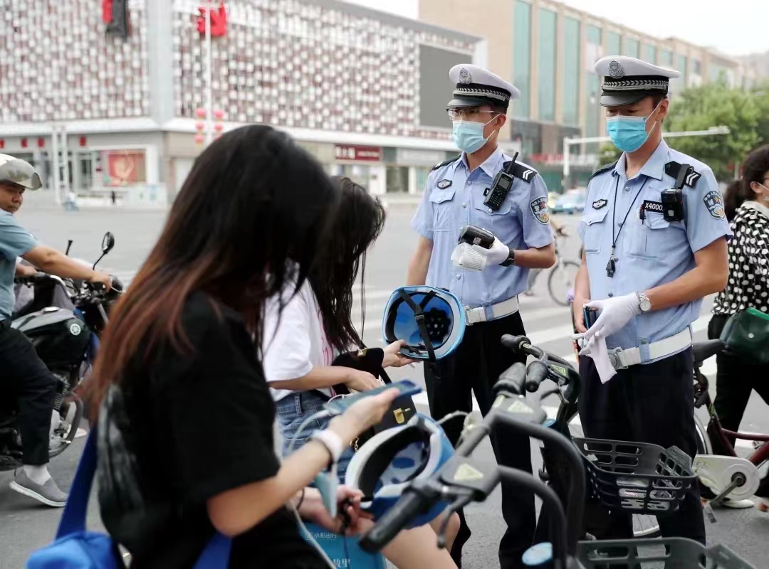 (本网讯 景继光 通讯员 葛崇收) 为进一步推进文明城市创建工作,5月26日,运城市公安局盐湖分局交警大队四中队民辅警在华联岗开展电动车驾乘人员不佩戴头盔查处及劝导活动,民警在工作中发现,有些群众虽然“带”了安全头盔,但并没有“戴”上安全头盔,有的人把头盔放在了车筐里,有的人把头盔放在了后座上,有的人把头盔挂在了车把上,还有的人虽然戴了头盔,但是佩戴却不规范……