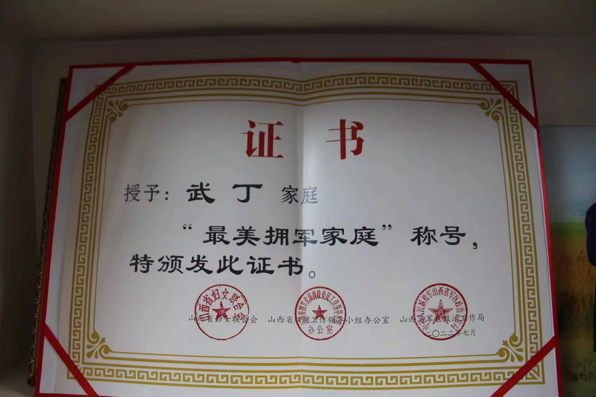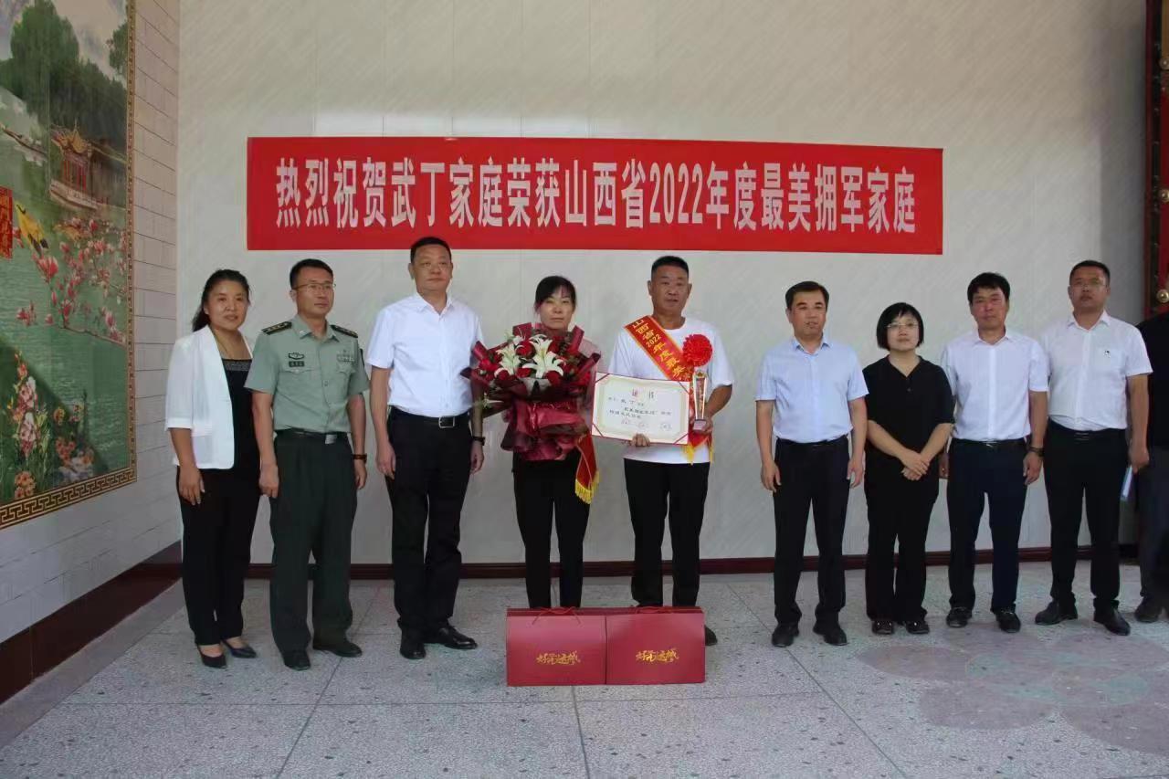 (本网讯 景继光 通讯员 吴国栋)8月17日,运城市退役军人事务局、县政府、夏县人武部、夏县退役军人事务局等单位联合为我县胡张乡武丁家庭举行“2022年度省最美拥军家庭”颁授仪式,并为其家庭送上荣誉证书、鲜花和礼品等。