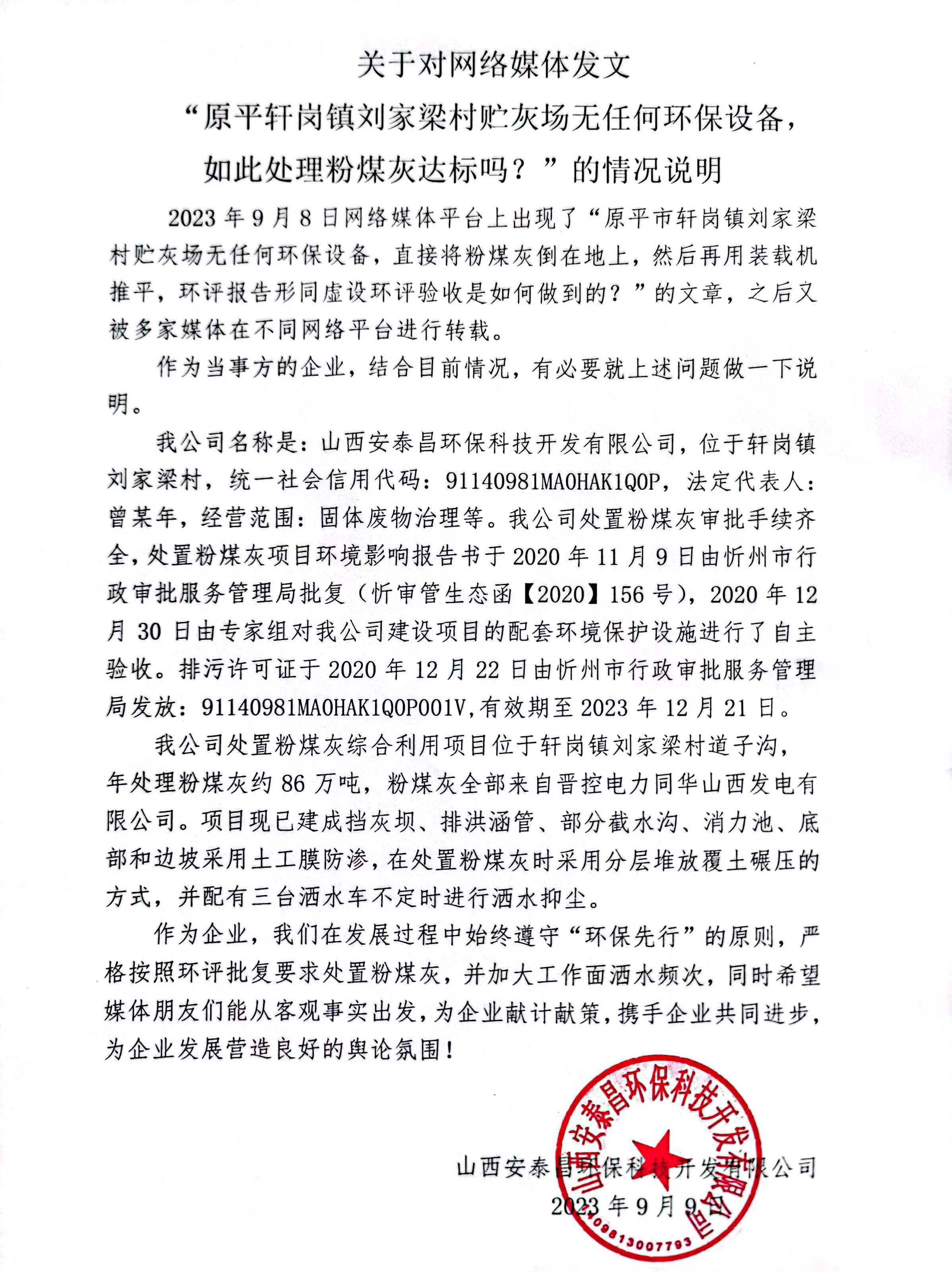 2023年9月8日网络媒体平台上出现了“原平市轩岗镇刘家梁村贮灰场无任何环保设备,直接将粉煤灰倒在地上,然后再用装载机推平,环评报告形同虚设环评验收是如何做到的?”的文章,之后又被多家媒体在不同网络平台进行转载。