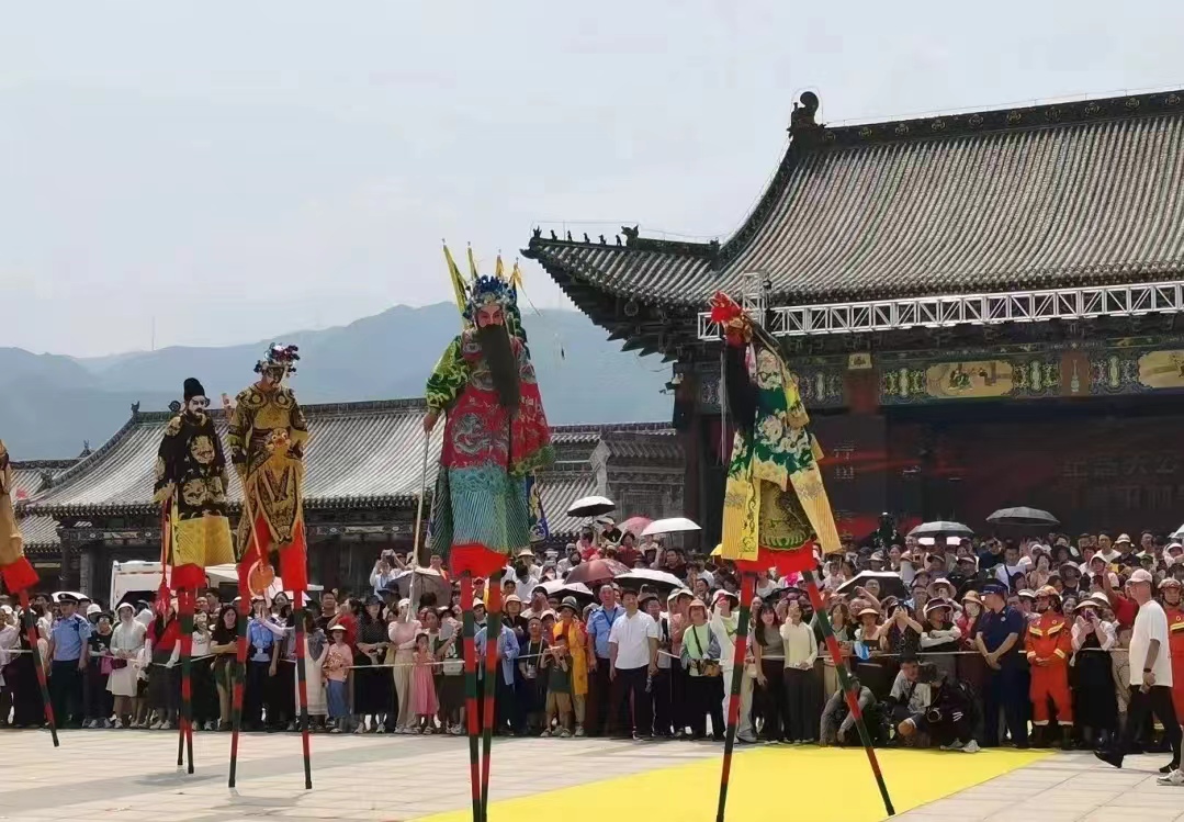 队伍浩浩荡荡,所到之处锣鼓喧天,礼炮声响彻云霄,吸引了众多游客驻足观看。同时,备受关注的还有非遗高跷表演,今年邀请了“火出圈”的甘肃牛站“醉关公”小林子团队,以踩高跷的形式再现“醉关公”风采,让观众们深感关公文化的独特魅力。
