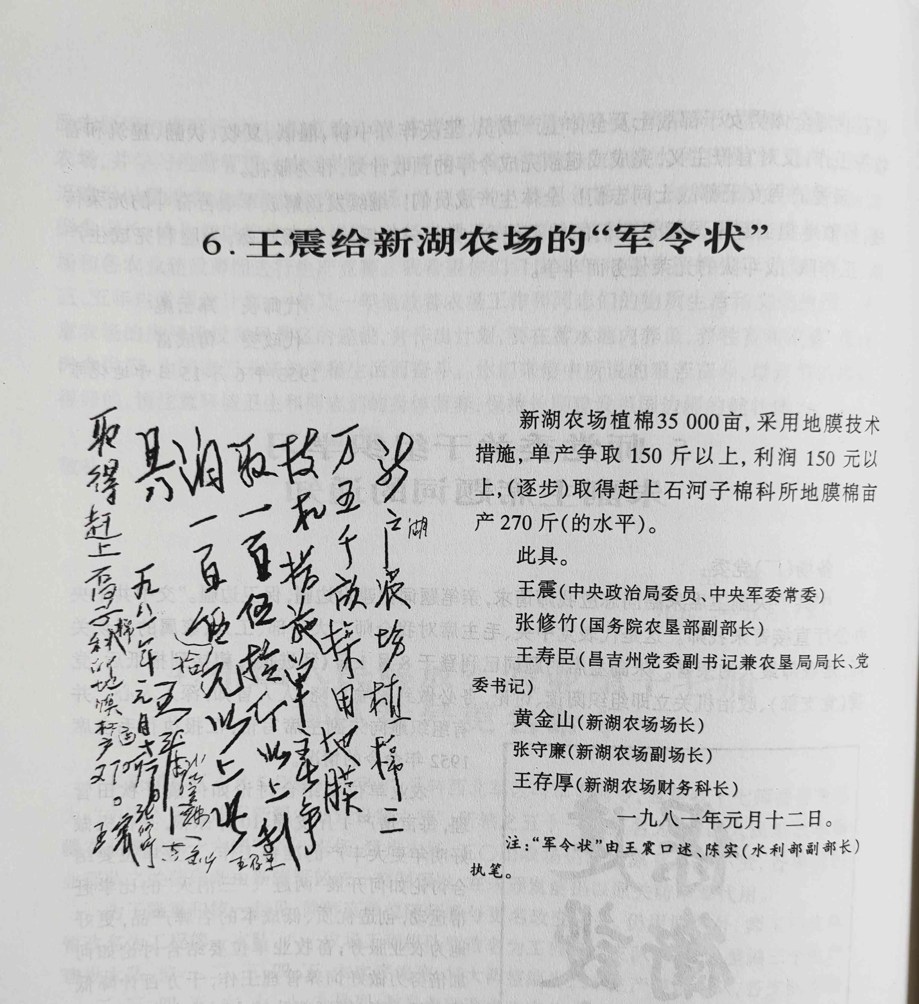 “新湖农场植棉三万五千亩,采用地膜技术措施,单产争取一百五十斤以上,利润一百 五十元以上……此具。一九八一年元月十二日。王震。”