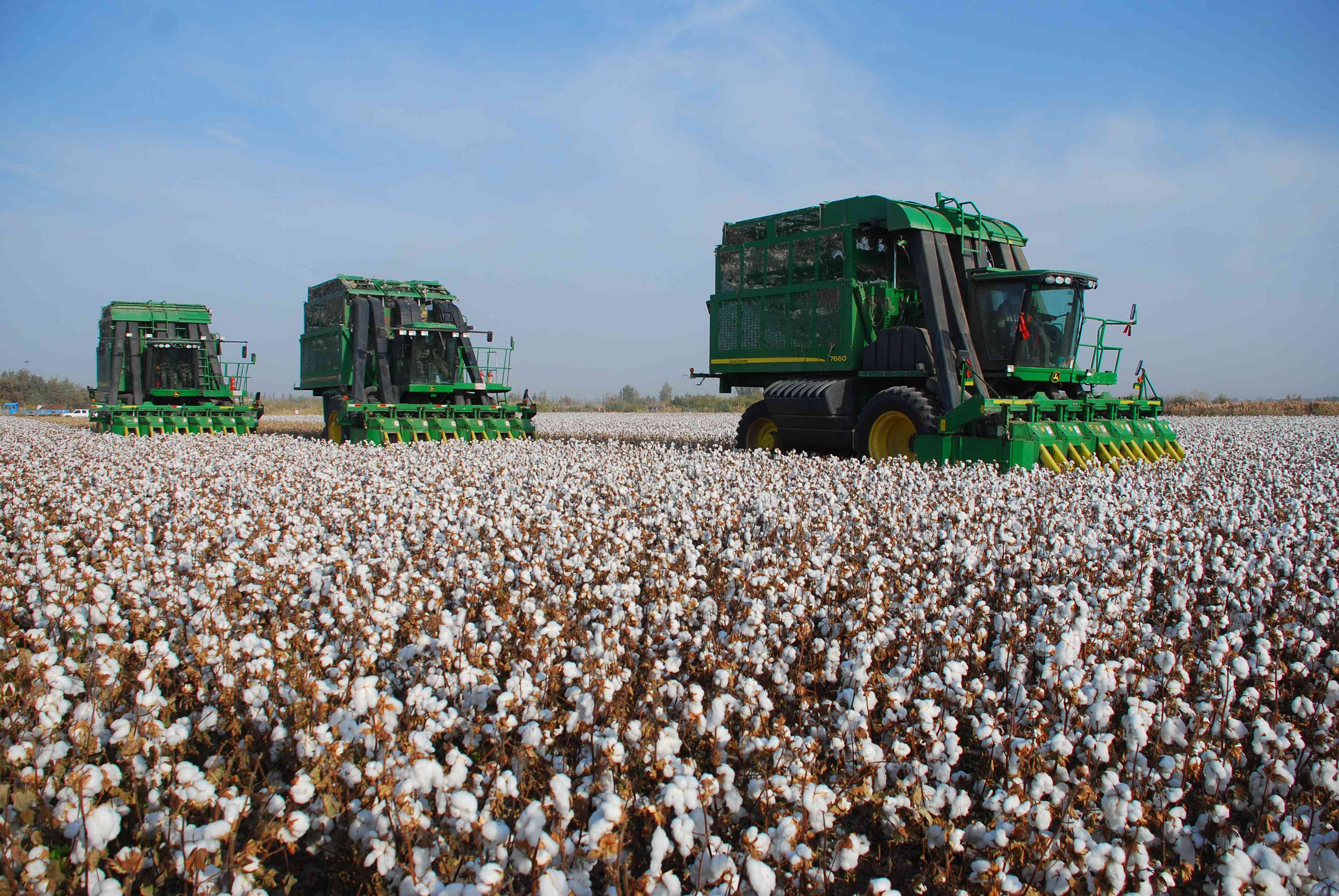随着自主创新步伐的加快,国产采棉机打破了进口采棉机的垄断。2022年金秋时节,新疆天鹅现代农业机械装备有限公司研发生产出具有完全自主知识产权的新型六行自走式打包采棉机,一举打破了国外技术垄断。首批“兵团造”六行自走式打包采棉机驰骋在银色的棉海,新湖农场60多万亩棉花,只用20多天就结束采收。