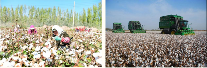 人工采摘棉花和机采棉的对比照片
