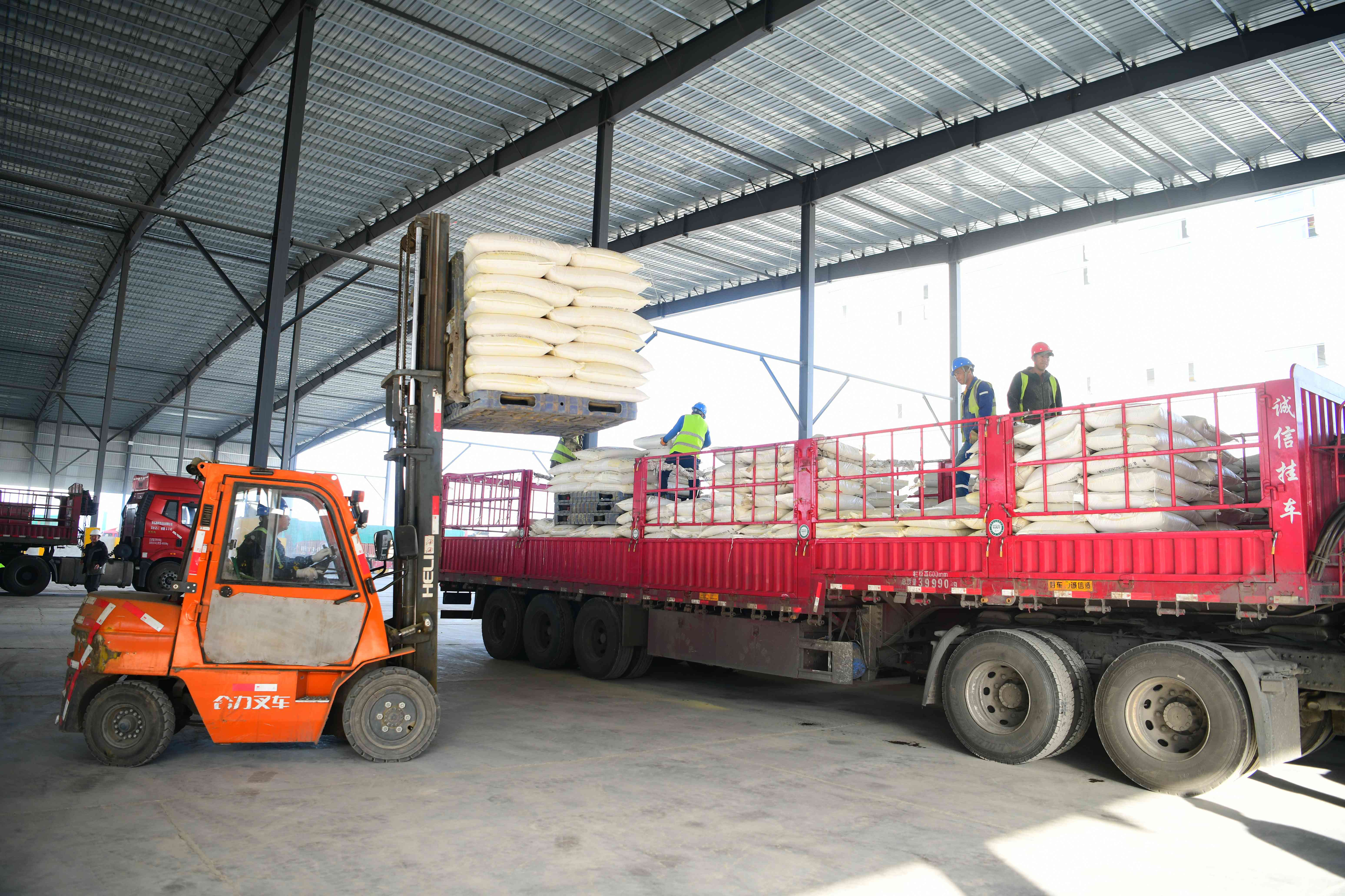 3月24日,在新湖农场新疆五家渠植物蛋白有限责任公司,工人正在将生产完成的棉籽脱酚高蛋白进行装车,准备销往内地市场。