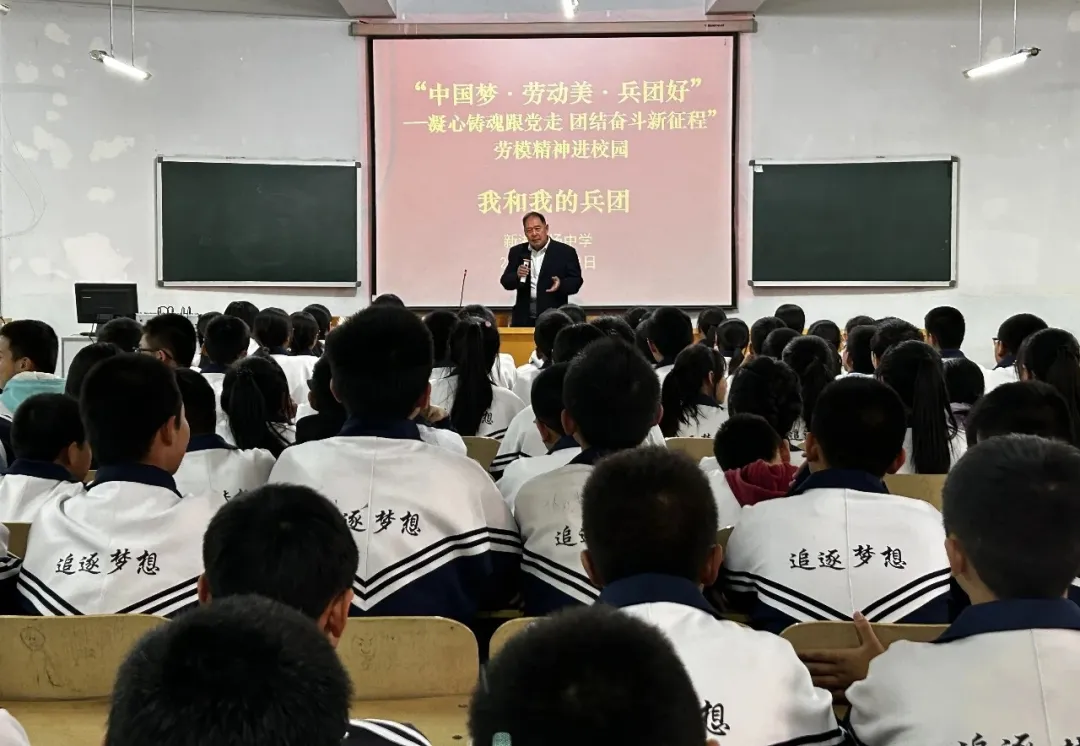 4月23日,自治区劳动模范王连成受邀以“屯垦戍边——我和我的兵团”为主题,给新湖总场中学师生上了生动的一课。